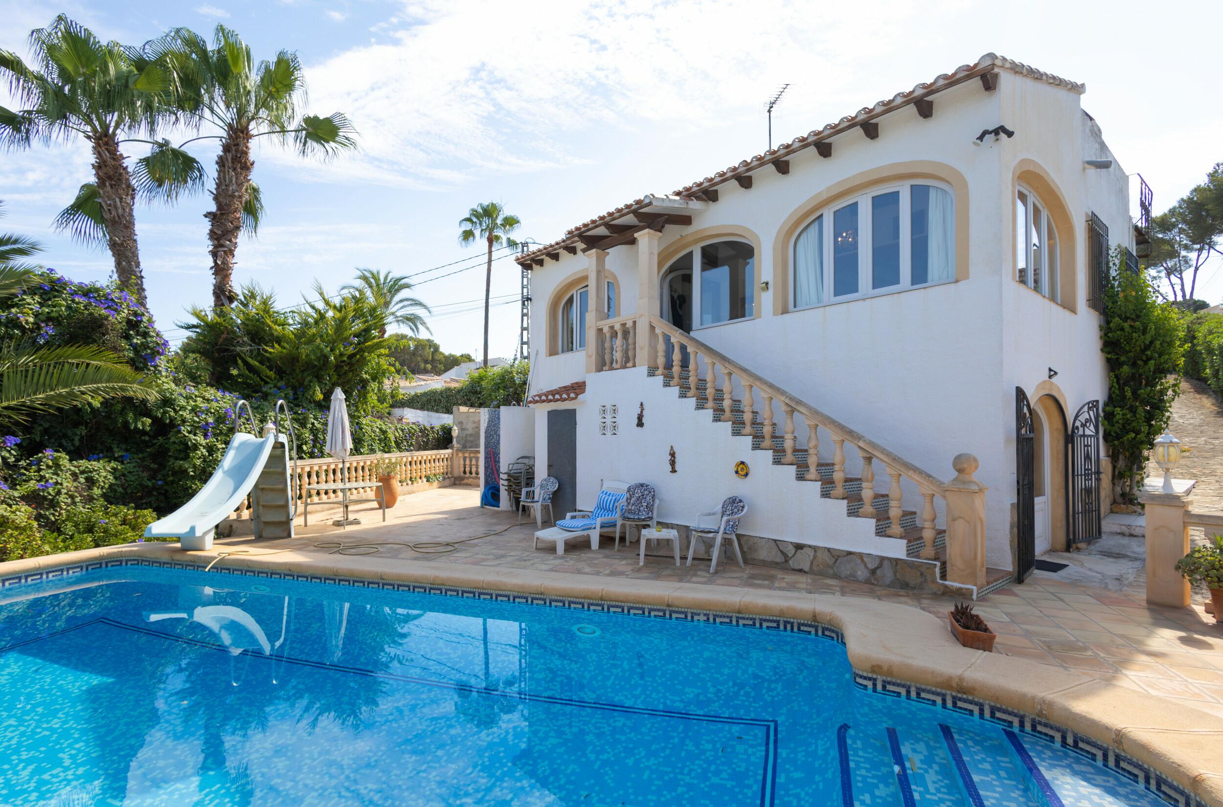 Located within a quiet cul-de-sac, this villa for sale has a tree and roof top view down the valley and you can also see the Montgo mountain standing its ground before Denia.